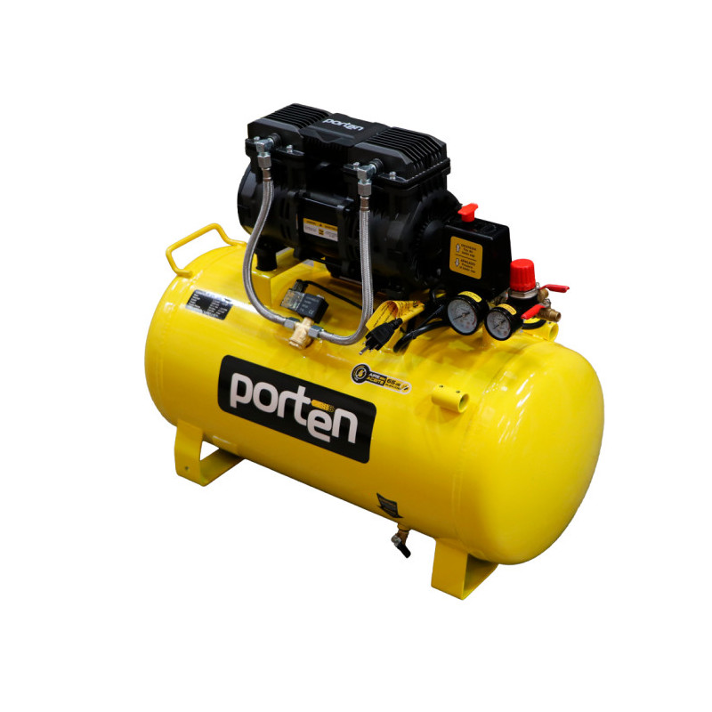 Compresor de Aire PCO-1650S Porten de 1.6 HP y 50L, silencioso y libre de aceite, ideal para trabajos que requieren aire limpio y bajo mantenimiento. Ofrece 116 PSI de presión máxima y 3.3 CFM de caudal, con motor eléctrico con protector térmico. Su tanque con ruedas y agarradera facilita el transporte en cualquier entorno de trabajo.